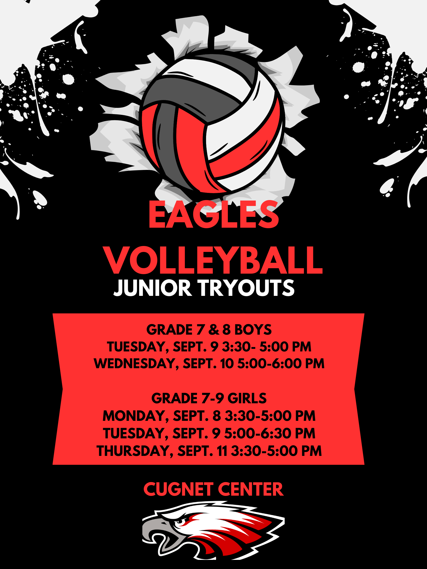 WCS JUNIOR EAGLES TRYOUTS WCS EAGLES JUNIOR VOLLEYBALL TRYOUTS Grade 7 & 8 BOYS Tuesday, Sept. 9 3:30- 5:00 pm Wednesday, Sept. 10 5:00-6:00 pm Grade 7-9 Girls Monday, SEPT. 8 3:30-5:00 pm Tuesday, Sept. 9 5:00-6:30 pm Thursday, SEPT. 11 3:30-5:00 pm Print