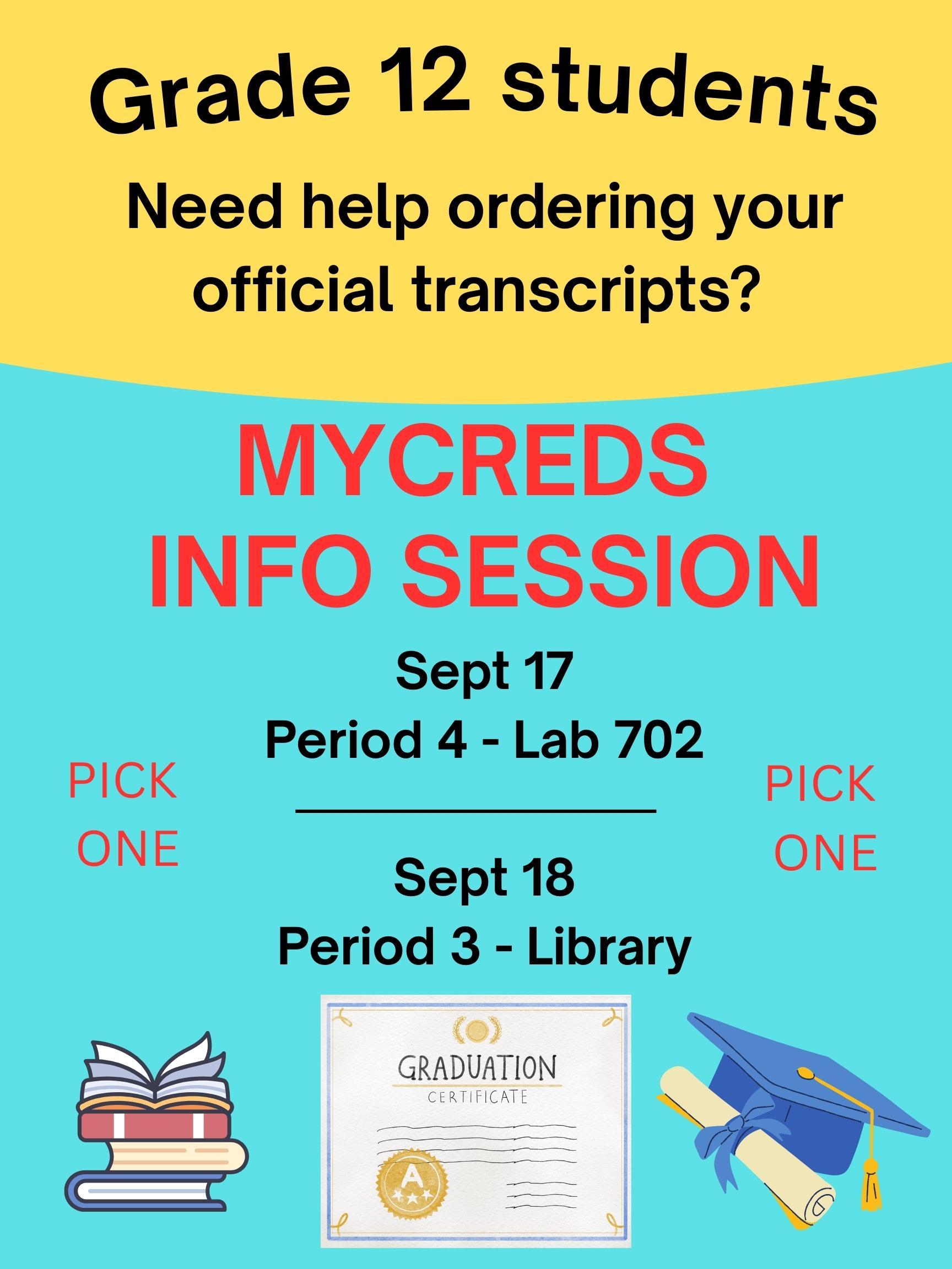 MYCREDS INFO SESSION: Grade 12 Students MYCREDS INFO SESSION- Grade 12 Students Need help ordering your official transcripts? Sept. 17: Period 4- Lab 702 OR Sept. 18: Period 3- Library Pick one! Posted on behalf of Mrs. Farrell and Mr. Whippler Print