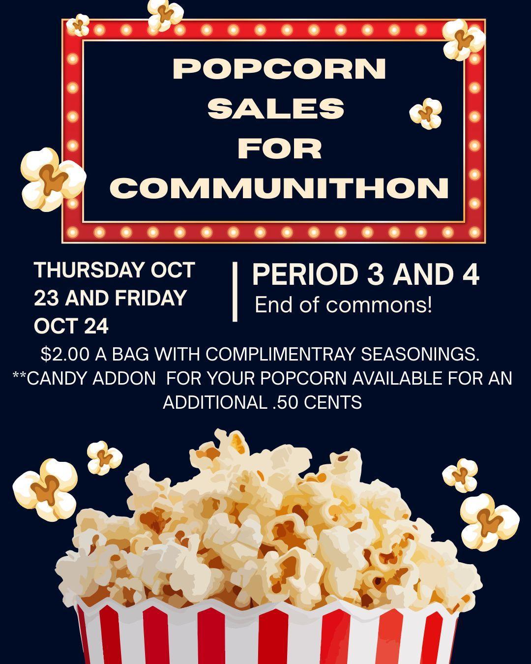 Popcorn Sales for Communithon 2025 Popcorn Sales for Communithon Thursday, Oct. 23rd and Friday, Oct. 24th Periods 3 & 4 End of Commons $2.00 a bag with complimentary seasonings Candy add-on for your popcorn available for an additional $0.50 Posted on Behalf of the SRC Print