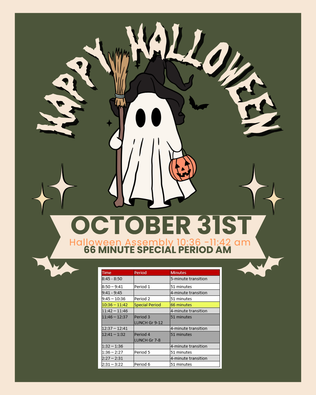 66 Minute AM Special Period Day Friday October 31st The Senior SRC is excited to host our Halloween Assembly which will be held on Friday October 31st in a 66 min MORNING Special period – 10:36 to 11:42am. Print