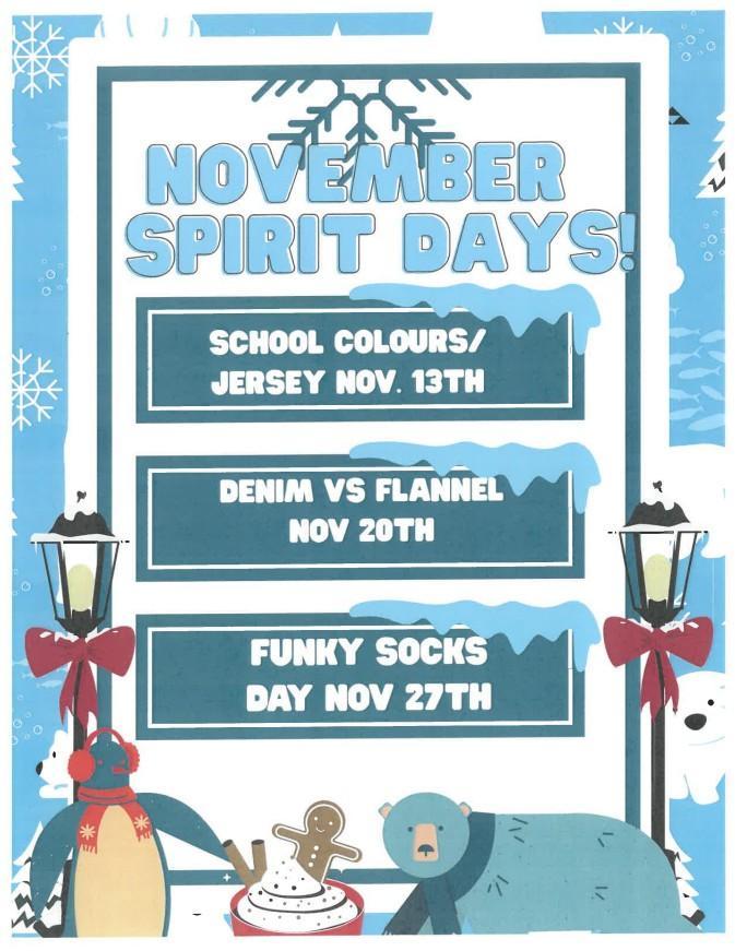 November Spirit Days WCS November Spirit Days School Colours/ Jersey Day November 13th Denim Vs. Flannel November 20th Funky Socks Day November 27th Show your spirit! Posted on behalf of the SRC. Print