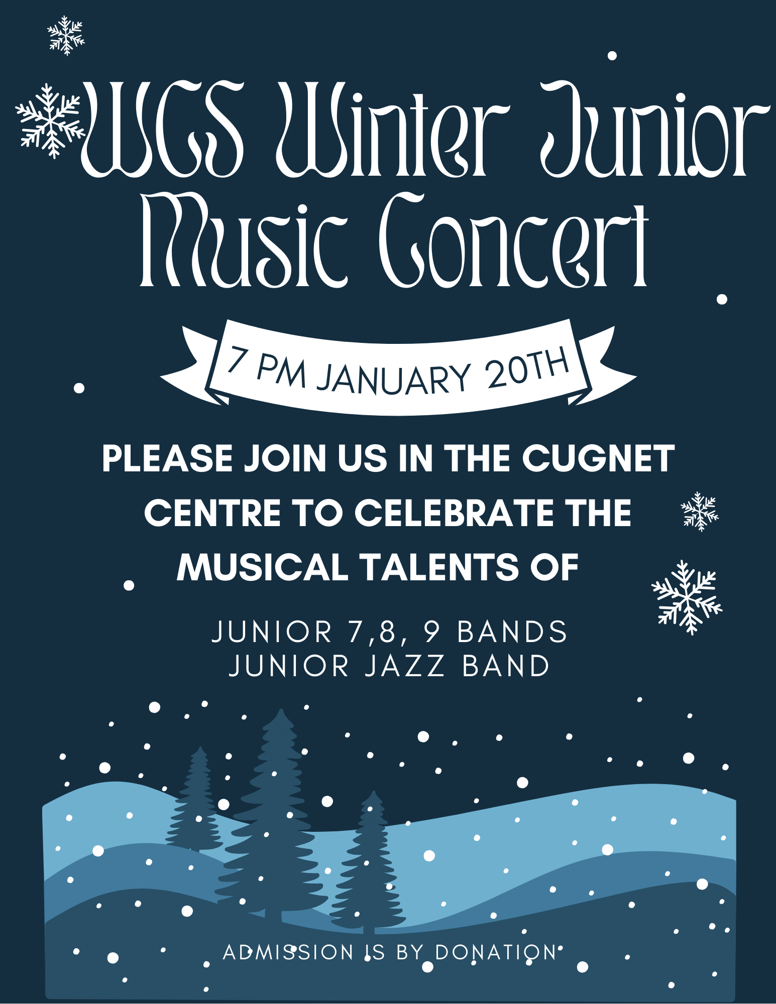 WCS Junior Winter Music Concert Rescheduled WCS Winter Junior Music Concert 7:00 pm January 20th, 2026 Please join us in the Cugnet Centre to celebrate the musical talents of our Junior 7,8, 9 Bands Junior Jazz Band Print