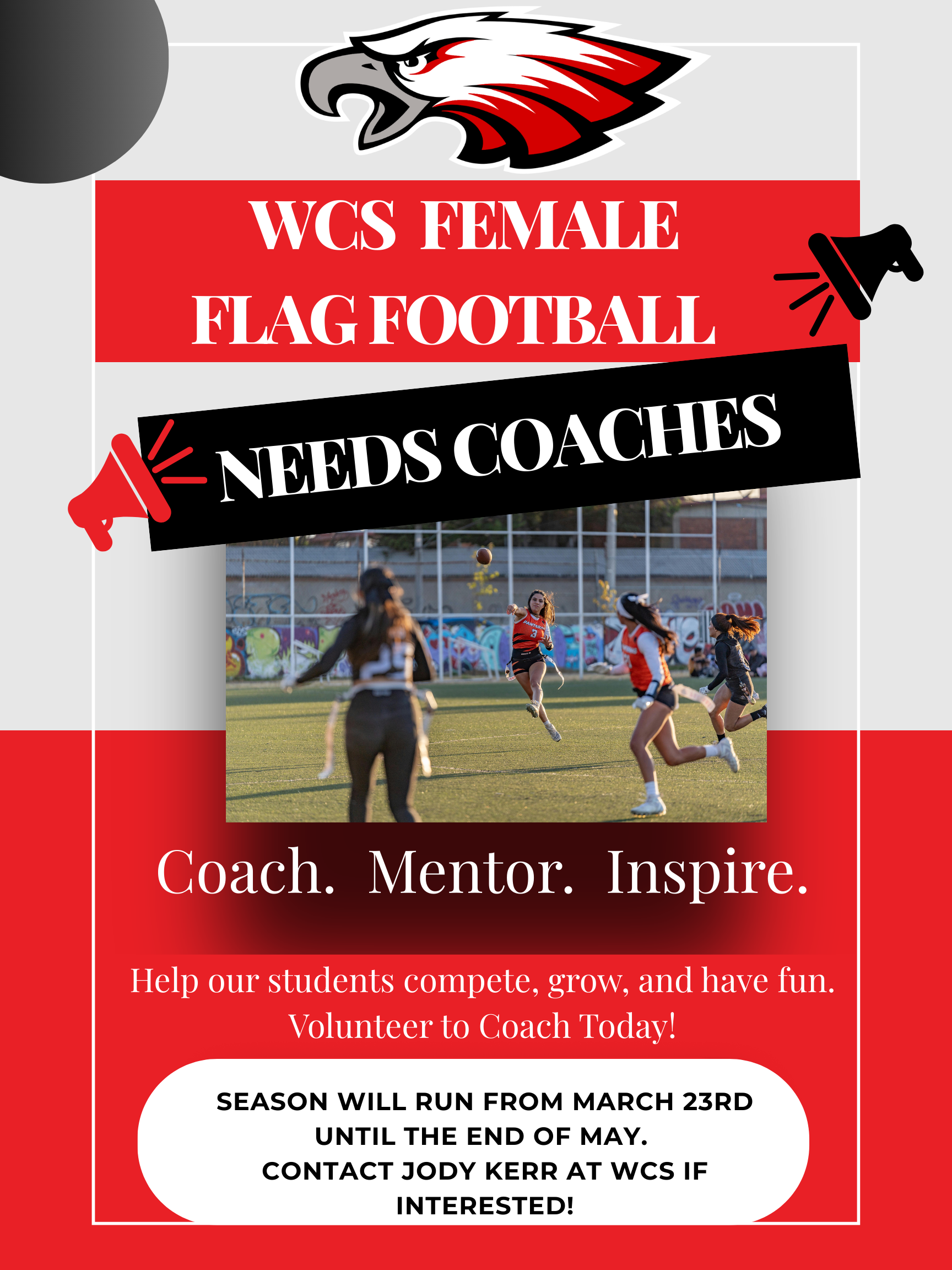 WCS Female Flag Football Needs Coaches WCS FEMALE FLAG FOOTBALL NEEDS COACHES Coach. Mentor. Inspire. Help our students compete, grow, and have fun. Volunteer to Coach Today! Season will run From March 23rd until the end of May. Contact Jody Kerr at WCS if interested! Print